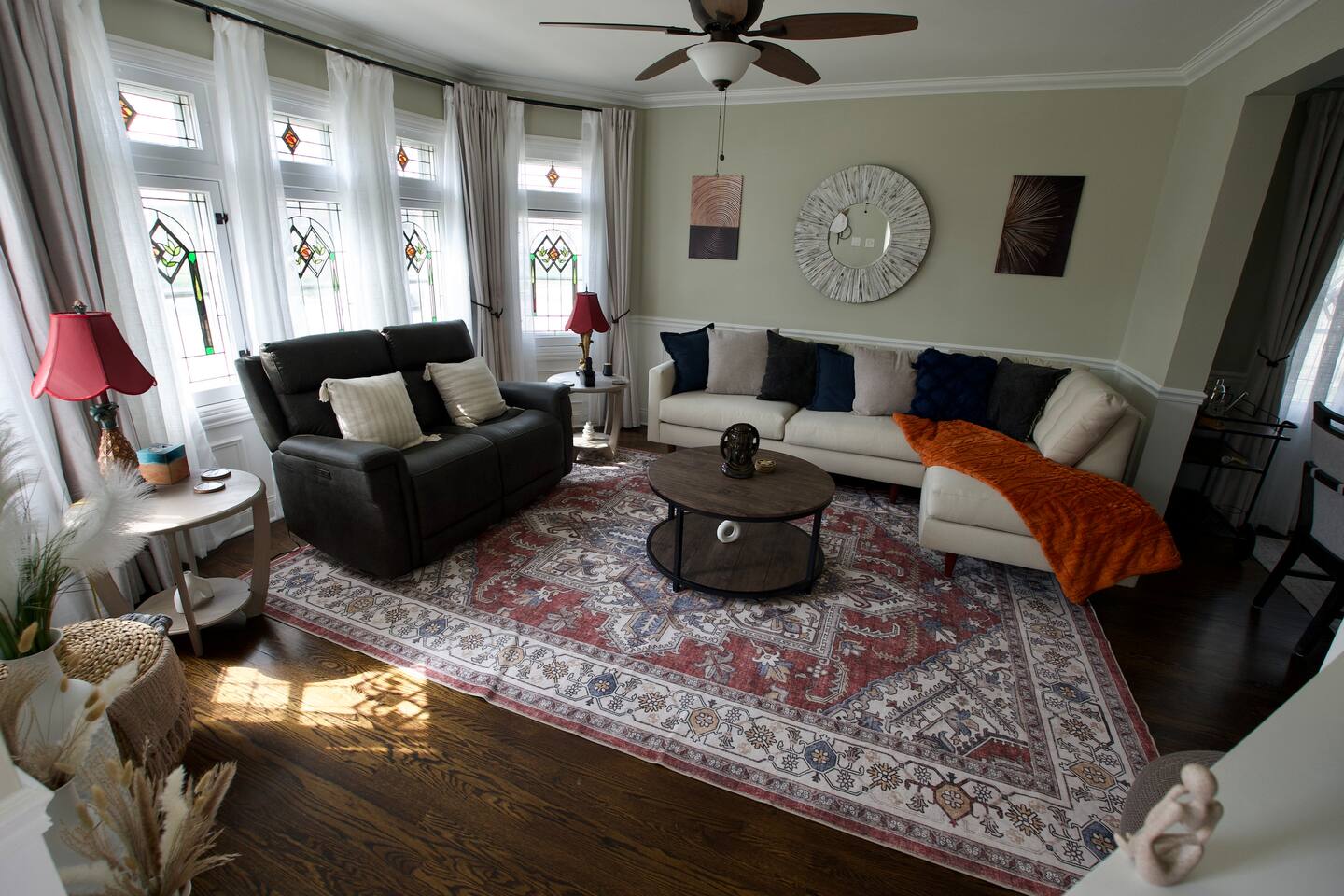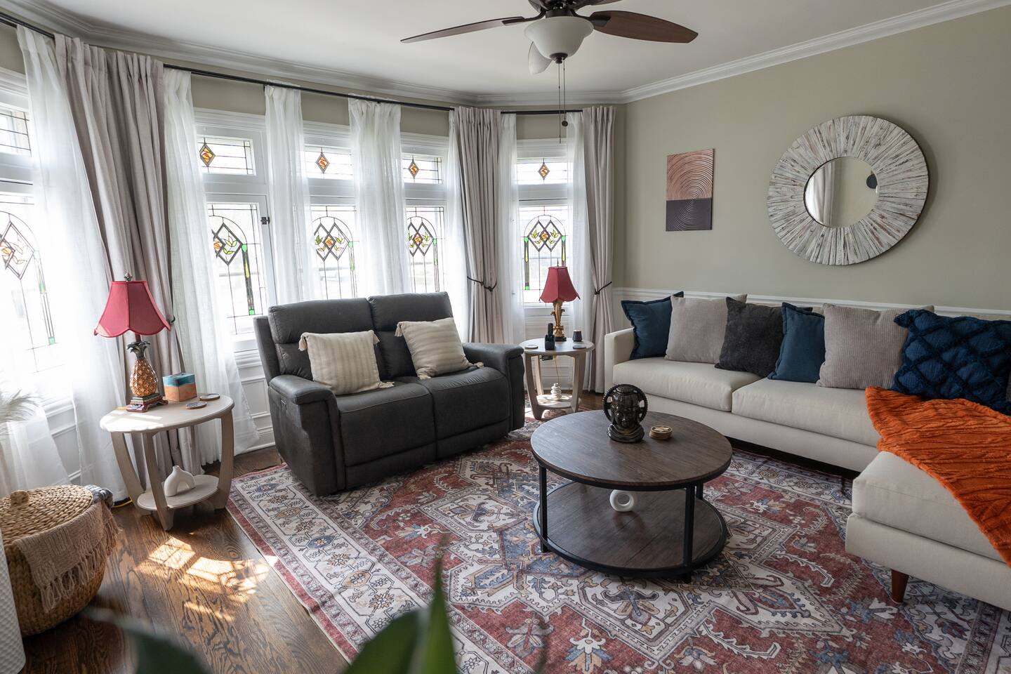 Beautifully preserved historic bungalow in the heart of Berwyn—just 23 minutes from downtown Chicago. This stunning five-bedroom, two-bath retreat blends classic elegance with modern convenience, making it the perfect home base for families, groups, or business travelers looking for comfort and character. Centrally located and walkable. Exquisite stained glass windows that fill the home with charm and natural light. We now offer a car rental directly through our Turo listing upon request.